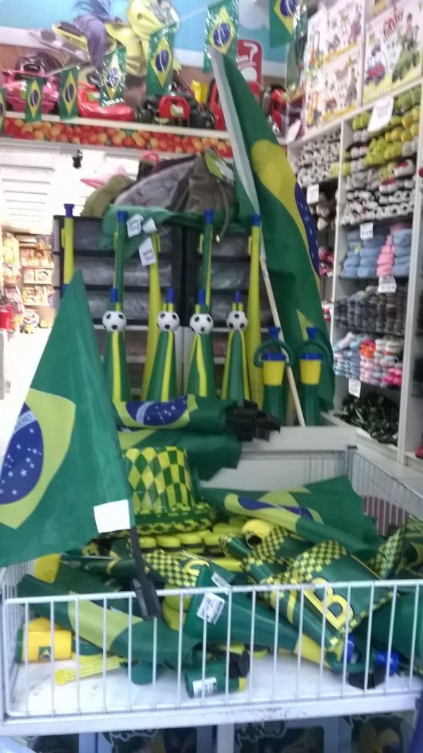 Se o primeiro jogo do Brasil na Copa do Mundo, ontem, deixou você, leitor, mais empolgado com o Mundial, a Alameda Doutor Muricy, no Centro de Curitiba, é um ótimo lugar para comprar bandeirinhas, cornetas e afins. Entre os apetrechos temáticos para o carro, há os protetores de retrovisor com as cores do país, que saem por R$ 12 o par. As bandeirolas que se encaixam no vidro do veículo são encontradas por R$ 6,99. Há também adereços como peruca verde e amarela, lenço e colar havaiano.