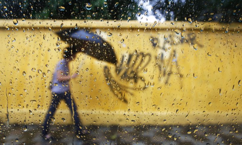 Chuva nem sempre é tragédia. A mesma chuva que destrói nas encostas ou beiras de rios garante uma melhor produção agrícola, repõe a água potável dos mananciais e, muitas vezes, serve de inspiração a poetas. "Chove chuva, chove sem parar...", por exemplo, é música de sucesso cantada por Jorge Ben Jor. E o que dizer desta cena captada pela lente do repórter fotográfico? As gotas de chuva compõem um quadro magnífico com o rapaz de guarda-chuva e a pichação no muro amarelo.