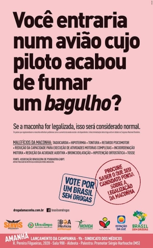 Anúncios de uma campanha contra o uso recreativo da maconha, publicados em jornais de Fortaleza (CE), estão dando o que falar. As peças, criadas por um movimento chamado "Brasil sem Drogas", trazem perguntas como: "Você teria coragem de ser operado por um médico que acabou de fumar um baseado?" e "Você pegaria um ônibus cujo motorista só dirige chapadão?". Todos os questionamentos são seguidos da resposta: "Se a maconha for legalizada, isso será considerado normal" e de um carimbo lembrando que é preciso saber o que os candidatos pensam sobre a legalização da droga. Independentemente do posicionamento sobre a legalização ou não da substância, fica aqui a pergunta apesar de a venda de bebidas ser permitida no país, é considerado normal ver médicos e motoristas trabalhando sob efeito do álcool?