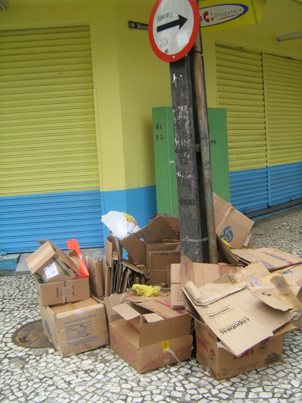 Fosse num dia normal, esse monte de papelão não duraria muito tempo ao pé dessa placa, na esquina das ruas Pedro Ivo com José Loureiro, região central de Curitiba. Ontem, porém, era feriado municipal, e apesar de haver bastante gente no centro, não era dia de trabalho. Por isso é compreensível que também os catadores tenham tirado uma folga, já que também são filhos de Deus, como disse uma dessas profissionais.