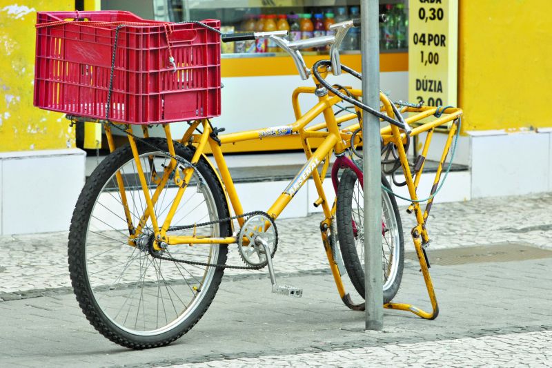 As calçadas das ruas centrais de Curitiba, em grande parte estreitas e já cheias de empecilhos, como orelhões e placas de sinalização, são ainda mais obstruídas por bicicletas como a da foto, usadas para entregas. Por medida de segurança, os donos de estabelecimentos comerciais prendem as bikes com cadeados em postes (foto acima), mas não lembram que isso atrapalha a mobilidade dos pedestres. Quando algum cadeirante tem de passar pelo local, então, a coisa fica mais complicada. Leitor sugere que, em cada quadra, sejam instalados bicicletários especiais para as magrelas.
