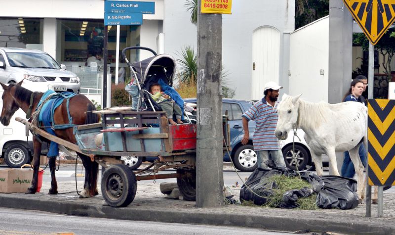 A presença de carroças e cavalos nas ruas de Curitiba não é tão rara assim, mas flagrar alguém tratando um de seus animais é um pouco mais difícil. Na foto, o dono da carroça descobriu alguns sacos cheios de capim numa esquina do Bairro Pilarzinho e não teve dúvidas: abriu um deles para dar de comer ao tordilho. O outro cavalo, justamente o que puxava a carroça, ficou sem a merenda pelo menos naquele momento. Sobre a carroça, deitado num carrinho, um bebê observa a paisagem alheio a tudo.