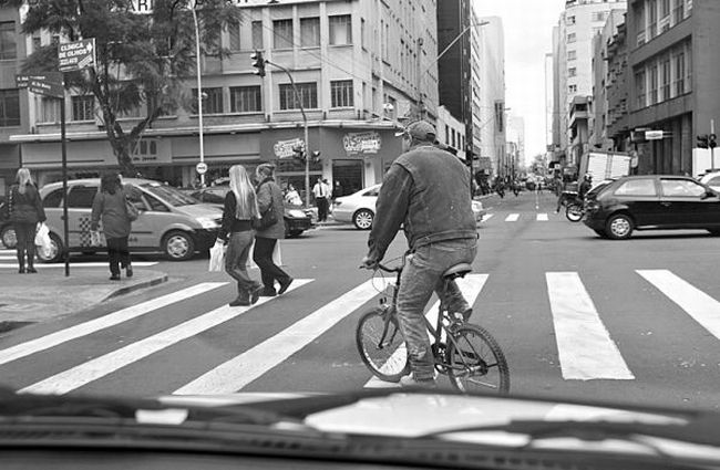 O trabalhador da foto circula pelas ruas centrais de Curitiba nessa pequena bicicleta. Percorre os trechos que precisa muito mais rapidamente do que se o fizesse de ônibus, com a vantagem de não poluir o ambiente. Assim como as motos, no entanto, a bicicleta é um veículo e, como tal, deve obedecer às regras de trânsito. Assim, se o cidadão da foto está correto ao escolher a "magrela" para seus deslocamentos, comete uma infração ao andar com ela na faixa de pedestres.
