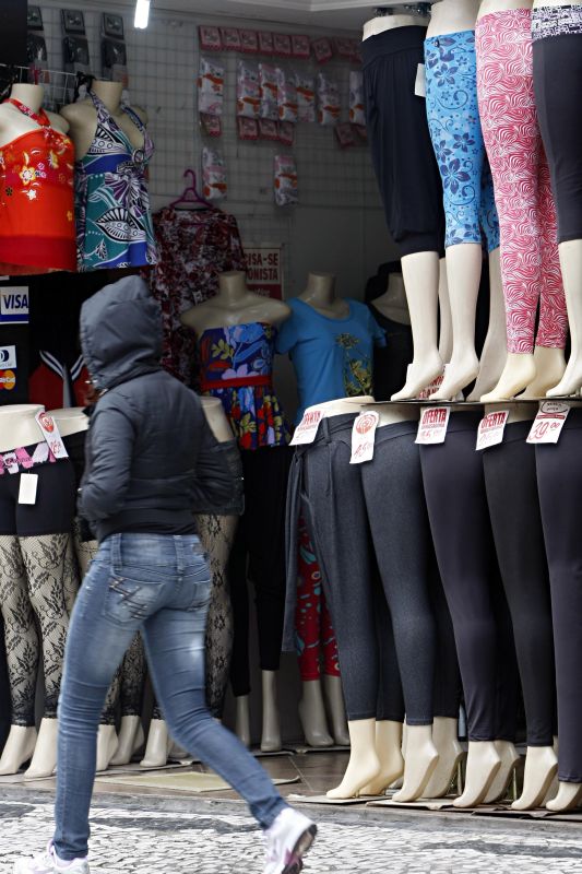 Enquanto a loja expõe vários modelos de calças legging, conhecida em outros tempos por fusô (ou ainda fuseau, no original francês), a garota passa na frente da vitrine alheia ao apelo. Afinal, é obrigada a puxar o capuz da jaqueta para se proteger do ventinho frio e do chuvisco irritante que atingiu Curitiba nos últimos dias. Ou seja, o dono dessa loja não "se ligou" no clima ou então pretendia que suas clientes usassem as ditas calças como se fossem ceroulas.