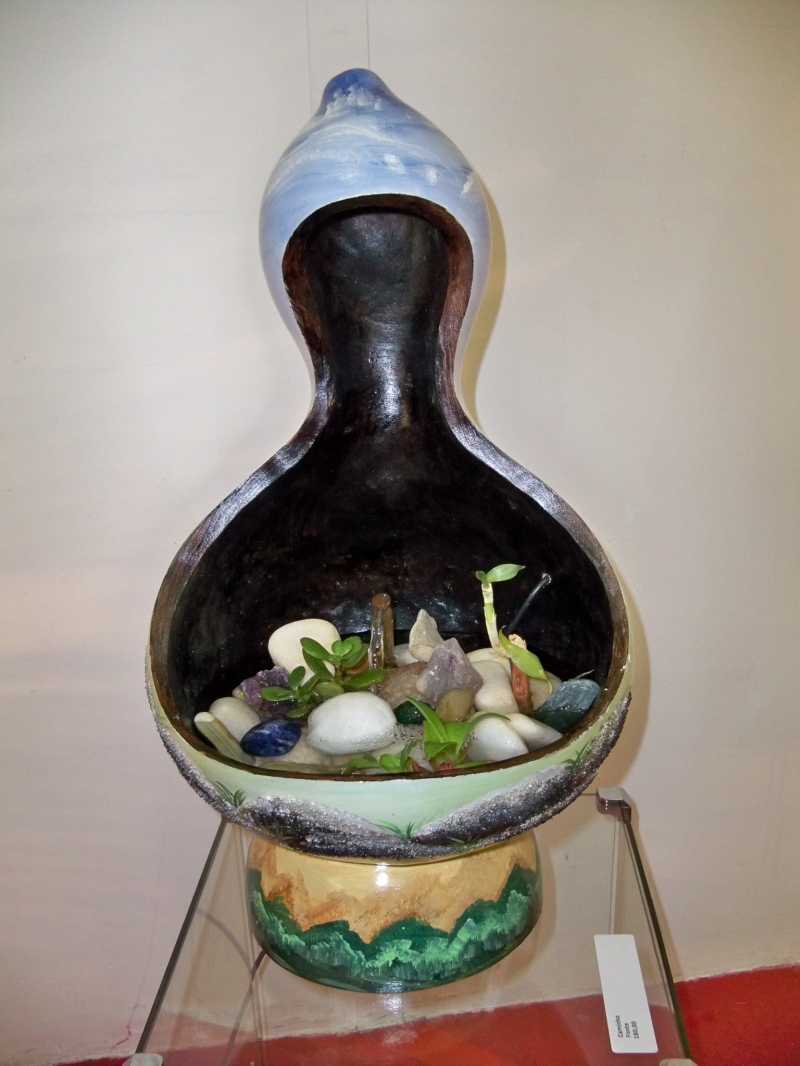 A Lagenaria siceraria (cabaça), chamada de Kuya pelos indígenas tupis e também conhecida como porongo no Sul do Brasil (enfim, a popular cuia de tomar chimarrão), rende também ótimos trabalhos artísticos (foto). É o que pode ser conferido na exposição "Encontros", mantida pela paranaense Mari Lucena e o paulista Walter Ocampo, com promoção do Sesc, no Cascavel JL Shopping. A visita pode ser feita até o dia 15 de agosto. As peças estão à venda e o casal de artistas aceita encomendas. Informações: (45) 3039-1773.* * * * *