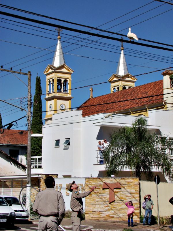 Você já viu o Corpo de Bombeiros mobilizado para fazer o resgate de um pato? Pois foi o que aconteceu em Santo Antônio da Platina, no Norte Pioneiro do Paraná. O pato fugiu de uma feira livre no sábado, onde estava à venda, e se alojou no alto de um prédio. Durante o dia ficou passeando na rede de alta tensão. Os bombeiros se mobilizaram ontem de manhã pra resgatar a ave, mas ela deu um verdadeiro baile na equipe. O pior é que o pato está virando celebridade na cidade e já tem gente querendo levar o bicho para casa, como animal de estimação.