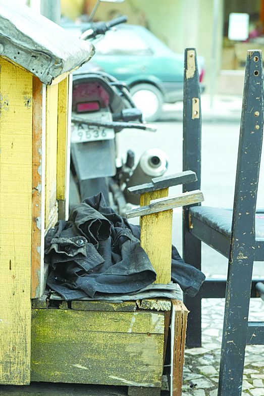 Coisa das mais fora de moda é engraxar sapatos na rua, e por uma razão simples: cada vez menos homens usam sapatos "engraxáveis" no dia a dia. A não ser que seja obrigado pelo tipo de trabalho, o homem vem preferindo usar tênis ou então esse híbrido chamado sapatênis, que pode estar mais sapato do que para tênis, mas mesmo assim dispensa a graxa. E o resultado são essas cadeiras de engraxates quase abandonadas nas praças da cidade (na foto, uma cadeira da Praça Carlos Gomes).