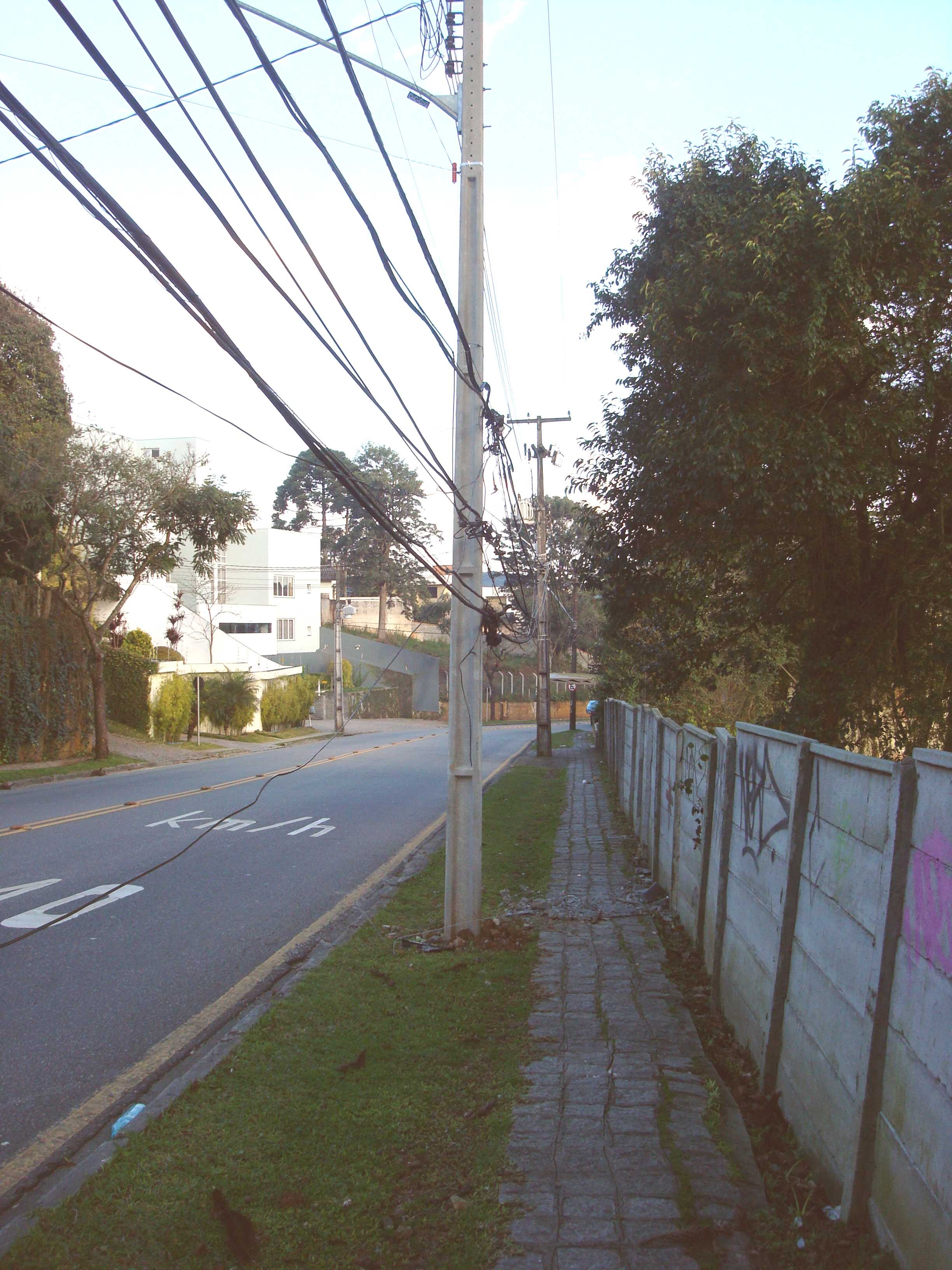Provavelmente danificado em algum acidente da madrugada, este poste foi substituído. Mas a Copel fixou apenas os "seus" fios, ou seja, os cabos de energia elétrica. Os cabos mais baixos, de telefonia, banda larga, tevê a cabo e sabe-se lá mais o quê, esses continuaram soltos. Tomara que os técnicos dessas empresas compareçam ao local e façam a devida fixação. O endereço? A Copel deve fornecer...