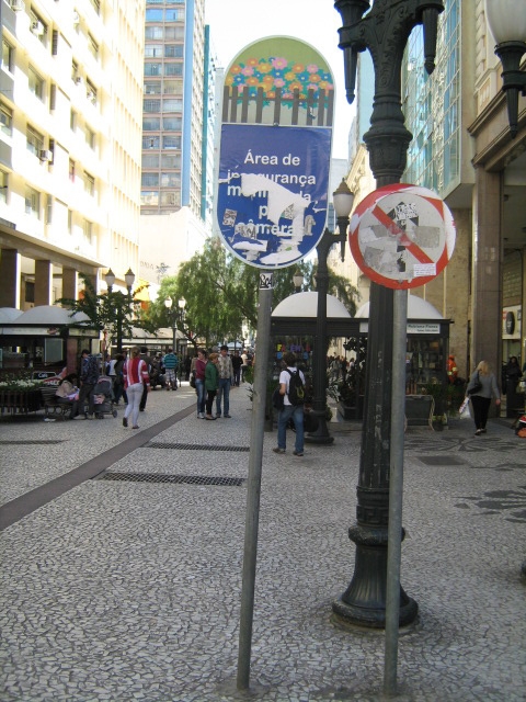 Daria para oferecer um doce a cada pessoa que conseguir ler rapidamente o que está escrito nessa placa que fica na esquina dos calçadões do XV e Monsenhor Celso. Olhando com mais atenção dá para ver o letreiro "Área de segurança monitorada por câmeras", mas vários papéis colados sobre a placa impedem uma leitura mais precisa. São folhetos principalmente com anúncios de vagas de empregos, que jamais deveriam estar ali.