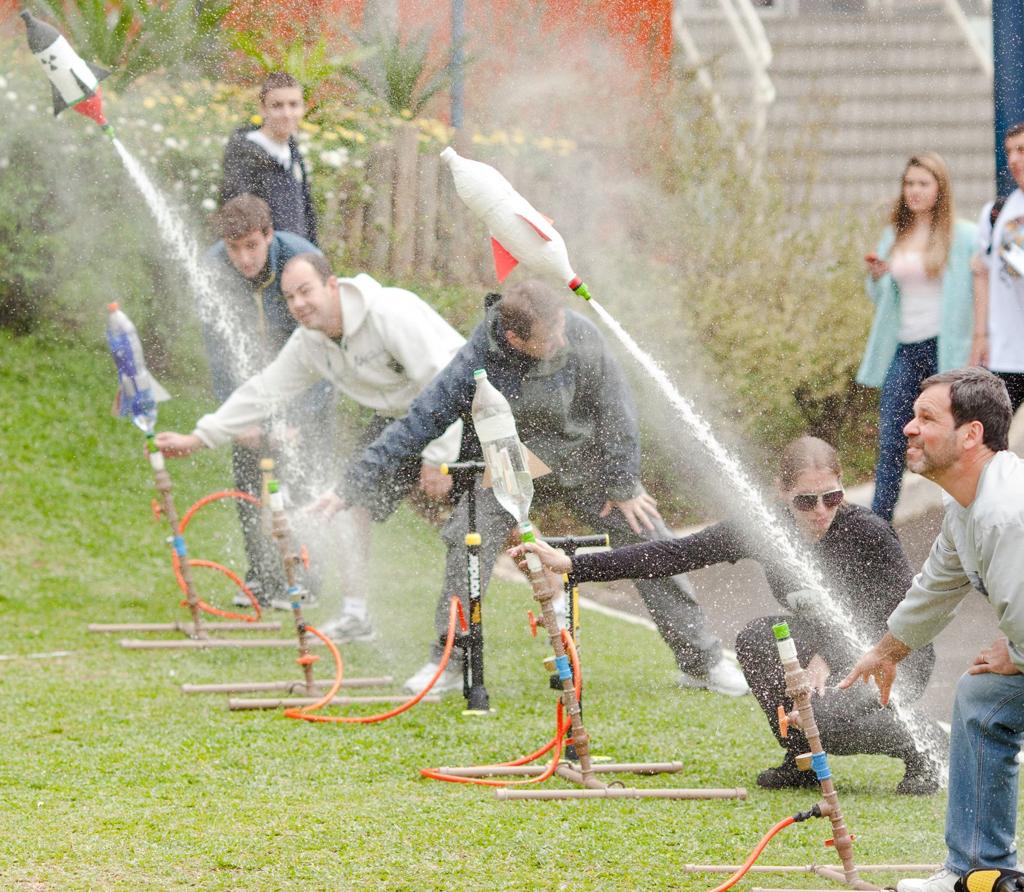 A toda ação corresponde uma reação, na mesma intensidade, direção, e sentido contrário. É o que diz a 3ª Lei de Newton, uma daquelas regras da Física que dizem muito sobre o nosso dia a dia. É ela que explica a dor daquele chute na quina da mesa, por exemplo, pois a mesa “te chuta” de volta. No Colégio Positivo, a piazada resolveu comprovar essa lei de uma forma mais explosiva. Cerca de 300 alunos do ensino médio trabalharam no último bimestre na confecção de 80 foguetes, que serão lançados no próximo sábado (27), das 8 às 11 horas, no Colégio Positivo Júnior. O foguete funciona com o mesmo princípio de um balão: o ar é liberado no sentido do chão, e o objeto “voa” na direção contrária. A atividade vai ser supervisionada por professores e pedagogos, responsáveis por garantir a segurança e a didática dos lançamentos.
