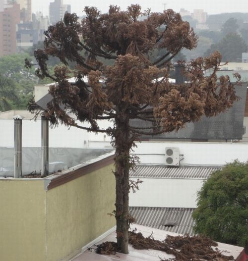A foto foi feita por uma moradora indignada do Cabral, bairro nobre de Curitiba. Da janela do apartamento dela é possível ver o estrago que a chaminé de uma pizzaria causou a um pinheiro, "sufocado" pelo telhado do restaurante. A moradora ligou para o 156 da prefeitura e para a Secretaria de Meio Ambiente mas, segundo ela, não foi tomada nenhuma providência até agora. O argumento dela tem lógica: quando ela se mudou para o bairro, há mais de 20 anos, o pinheiro já estava lá. O restaurante chegou, no mínimo, 15 anos depois.