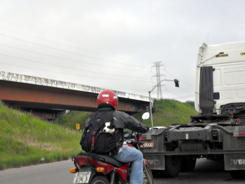 Você consegue identificar o que o motociclista está carregando em sua mochila? Isso mesmo, um cãozinho branco e preto que parece estar bem à vontade. Fica, porém, a pergunta: é seguro transportar um animal assim? Obviamente que não! Ele pode se assustar com alguma coisa e levar o condutor da moto a realizar algum movimento involuntário. Pode também cair dali e provocar mudanças de direção de carros e motos que vêm atrás... Enfim, não é a melhor forma de carregar um cão.