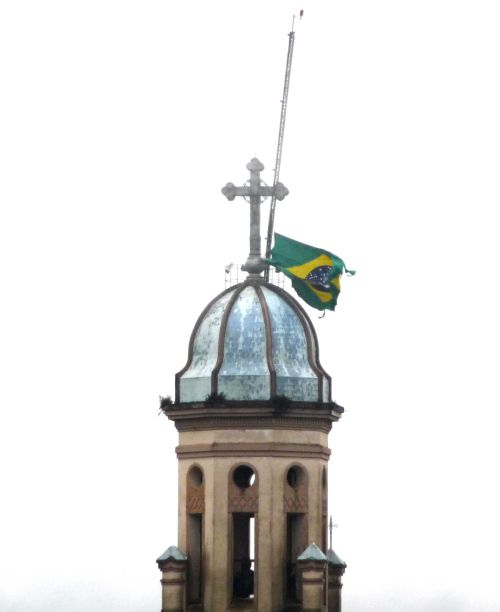 Os ventos que têm acompanhado as chuvas que chegam a Curitiba provocam danos de toda ordem, como a derrubada de árvores e destelhamento de casas. Bandeiras que permanecem hasteadas, como essa no alto da torre da Igreja das mercês (capuchinhos) também sofrem para se manter bonitas. Aos poucos, o vento vai esfarrapando o tecido.