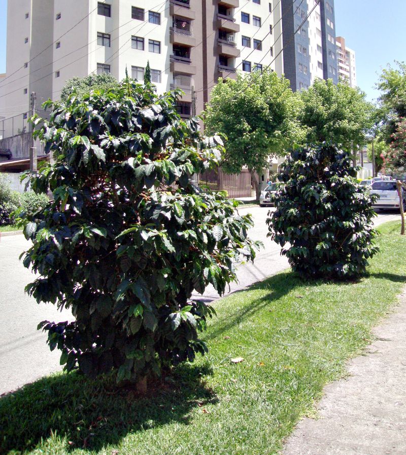 Curitiba não está exatamente na zona produtora de café do Paraná, mas de vez em quando aparecem casos de colheitas importantes nos quintais de moradores ligados ao Norte. Essas plantas da foto, no entanto, estão na rua em pleno centro da capital (o colaborador não informou o nome da rua), são muito viçosas e se encontram bem carregadas para os padrões locais. Resta saber quem fará o beneficiamento dos grãos.