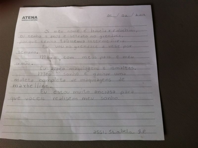 Três crianças com doenças graves terão nesta semana uma grande surpresa: os pedidos que encaminharam à fundação Make a Wish Brasil serão realizados por meio de uma parceria entre a ONG e o Shopping Curitiba. Na quinta-feira, na sexta e no sábado, os sonhos de Isabela (9 anos), Pedro (8) e Isabel (7) vão se tornar realidade e quem estiver no shopping poderá acompanhar a iniciativa. Moradora de Várzea Paulista (SP), Isabela tem uma doença sanguínea chamada talassemia maior e sonha em passar por uma transformação do visual. Ela ganhará penteado especial, maquiagem e até sessão de fotos. "A Isabela inscreveu o seu sonho por conta própria, em fevereiro deste ano. Ela sabe que vai para Curitiba com a tia, mas não sabe o que vai acontecer", conta Cláudia Lombardi, diretora-executiva da Make a Wish Brasil. A talassemia maior é uma anemia severa, que exige transfusões regulares de sangue e provoca palidez.