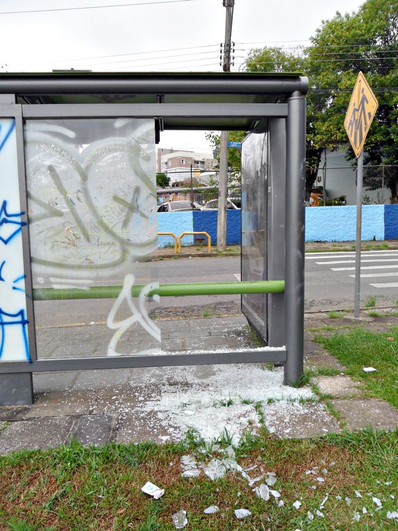 A coluna não iria mais tocar nesse assunto de vandalismo contra pontos de ônibus, em que desocupados misturam bebedeira com valentia e passam a promover algazarras. Só que esse ponto específico fica na frente de uma escola e o vidro está ali, esparramado pelo chão, há mais de três dias (pelo menos estava até as 10 horas da manhã de ontem). Como se pode ver, os outros vidros estão todos pichados. E esse que foi quebrado havia sido substituído há poucos meses antes. * * * * *