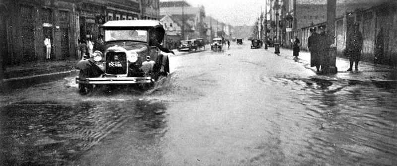 Agora vamos bater as portas da década de 1930. Já na esquina da Rua Barão do Rio Branco, temos a via mais importante de Curitiba: a Quinze de Novembro, já asfaltada e mantendo a sua fisionomia de logradouro estritamente comercial. Da esquina emborcamos pela Barão, em direção à Estação da Estrada de Ferro entretanto, nos vimos obrigados a parar e ficar olhando o pessoal trabalhando nos trilhos dos bondes, entre as ruas Visconde de Guarapuava e André de Barros. Afinal, como bons curitibanos, gostamos de ver os outros trabalharem. Como hoje estamos em dia de chuva, não podemos deixar de visitar uma boa enchente, embarcados num Pé de Bode, pela velha Barão do Rio Branco dos idos da década de 1930.