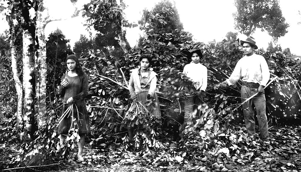 Uma família de colonos prepara os feixes de galhos de erva que foram podados e em seguida entrarão na sapecada (Foto: )