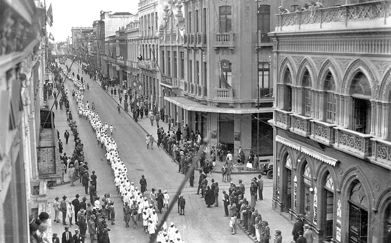 Para melhor ilustrar a presença dos trajes, tanto masculinos como femininos, vamos viajar em cima de antigas fotografias feitas entre os anos de 1905 até o presente. Iremos ao carnaval de rua daquele ano, em plena XV de Novembro superlotada de gente e todos se divertindo com as mais esmeradas vestimentas ou então, em menor número, fantasiados. Para o tempo presente escolhemos uma foto da Corrida do Facho efetivada no mês de agosto passado no Centro Cívico, onde o terno e gravata faziam parte do traje das autoridades do palanque oficial. Quanto aos militares podemos apenas afirmar que com seus impecáveis uniformes eles preservam através dos tempos uma tradição histórica. Quanto ao púbico em geral, podemos dizer que estavam em trajes dos tempos modernos: à vontadona!