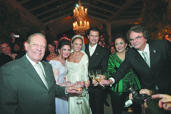Eram 23h40 quando os noivos, a médica Maria Angélica Muricy e o advogado Carlos Alberto Maluf Sanseverino entraram no salão do Castelo do Batel, onde os convidados os esperavam após o brinde entre a família, ao som de Mania de você, hit da cantora Rita Lee, uma das madrinhas do enlace junto com o marido, Roberto Carvalho. Sanseverino é advogado especializado em direito autoral. O casal foi ovacionado pelas 700 pessoas presentes. Neste momento, viam-se no alto flutes de Veuve Clicquot brindando à chegada dos noivos. "À vida!", repetia a apresentadora Hebe Camargo a quem estava próximo. À coluna, Hebe disse que poucas vezes aceitou ser madrinha de casamentos. "Sou difícil. Só sou madrinha quando acredito no casamento", disse. Ainda na sala reservada aos pais e padrinhos, a coluna pergunta a Rita Lee se foi difícil colocar vestido, já que no show que fez no último dia 20, no Guairão, ela disse que gostaria de vir ao casamento de calça. "Querido, estou de palazzo pijama", disse, exibindo o traje em cetim azul. "Queria vir de jeans, camiseta e tênis, mas o Carlinhos me pediu pra vir bonitinha", completou Rita, ao lado do filho do meio João Lee de Carvalho, 30 anos. Criada no catolicismo mas agnóstica, a cantora disse também que estreava como madrinha de casamento. "Gostei, foi muito especial". A cerimônia religiosa, na Igreja São Francisco de Paula, foi das mais emocionantes. Os convidados foram recebidos ao som de canto gregoriano. Logo após as boas-vindas do padre Sancley Gondin, de São Paulo, Agnaldo Rayol cantou a clássica Creio em Ti em dueto com o pai da noiva, o cirurgião plástico José Cândido Muricy, também dono de uma voz potente. Católicos fervorosos, os noivos fizeram uma belíssima declaração de amor no altar após a bênção e troca das alianças. Durante a comunhão, Agnaldo Rayol cantou sozinho a Ave Maria, arrancando mais lágrimas dos convidados.