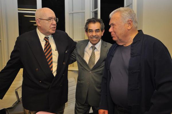 No lançamento do Vozes do Paraná 6, o autor da obra Aroldo Murá G. Haygert com o escritor David Delmiro da Silva e Jaime Lerner (Foto: Felipe Rosa)
