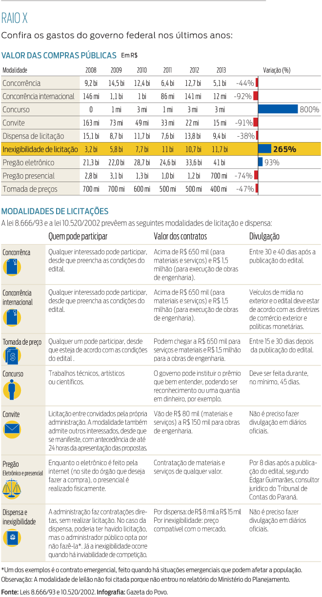 Nos últimos seis anos, enquanto as compras governamentais feitas por meio de licitação ficaram estáveis, a compra direta e sem concorrência conhecida juridicamente como inexigível cresceu 265%. O dado foi obtido no relatório "Informações Gerenciais de Contratações e Compras Públicas", que analisa o período de 2008 a 2013. Antes disso a metodologia era diferente.