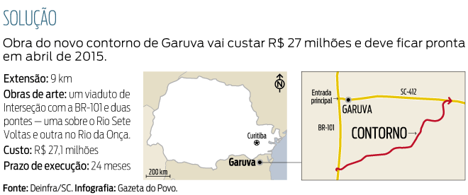 Uma obra no município de Garuva (SC) promete desafogar o tráfego na divisa do litoral do Paraná com Santa Catarina a partir de 2015. A intervenção de nove quilômetros, chamada de Contorno Sul, começou a ser executada em abril deste ano pelo governo catarinense. O trecho liga a BR-101 à cidade de Itapoá, em um gargalo famoso pelas filas de dezenas de quilômetros em épocas nas quais banhistas a maioria paranaense procuram praias da região.