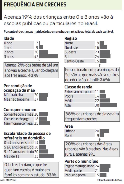 Apenas uma em cada cinco crianças brasileiras de 0 a 3 anos frequentam a creche. Além do baixo acesso, o país apresenta uma divisão social na utilização do serviço: a proporção de crianças assistidas aumenta quanto maior é a renda ou o nível de escolaridade da família. Nos lares extremamente pobres, uma em cada dez crianças vão à creche (11%). Entre as famílias de alta renda, a frequência sobe para 38% o dobro da média brasileira, que é de 19%. O dado faz parte do estudo "Primeira Infância em Números", produzido pela Secretaria de Ações Estratégicas da Presidência da República (SAE) com base em dados da Pesquisa Nacional por Amostra de Domicílios (Pnad).