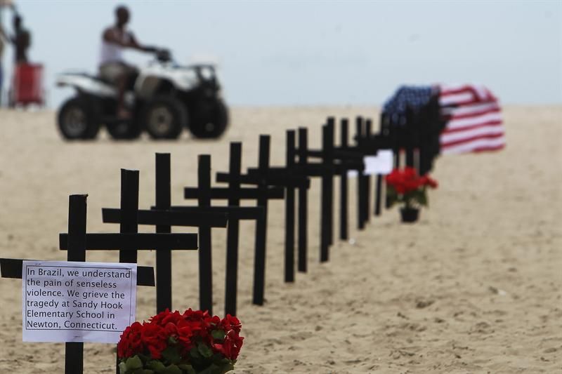 Um grupo de ativistas contra a violência cravou neste sábado dezenas de cruzes na praia de Copacabana, no Rio de Janeiro, em solidariedade às vítimas do massacre de ontem em uma escola primária nos Estados Unidos.