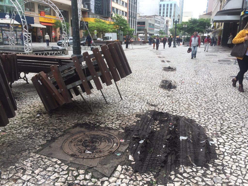 Ao menos três floreiras da Rua XV de Novembro, no Centro de Curitiba, foram encontradas danificadas na manhã desta segunda-feira (26). Fotos mostram que um dos suportes quase foi arrancado e, assim como os demais, teve suas flores parcialmente destruídas. Embora a Rua XV tenha recebido um show neste domingo (25), que reuniu entre 9 e 21 horas aproximadamente 70 mil pessoas, nem a Prefeitura de Curitiba nem os organizadores do evento apontaram qualquer dano ao patrimônio durante as atividades.