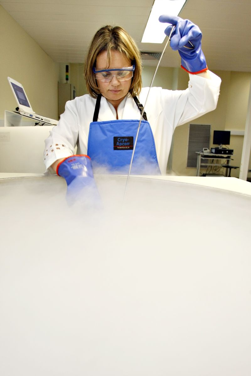 3 O sangue é armazenado num contêiner de nitrogênio líquido a uma temperatura de -150°C. O material não contém o nome do bebê ou da mãe, apenas uma identificação numérica, assim como informações sobre as características do sangue para futuros testes de compatibilidade.