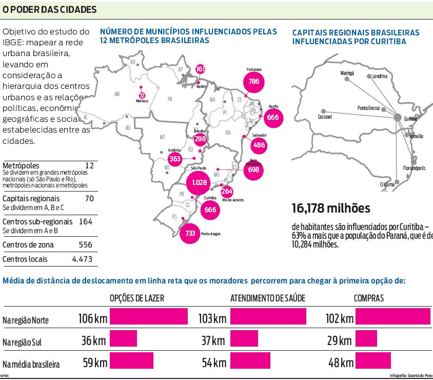 Curitiba é uma das 12 metrópoles brasileiras e divide com Porto Alegre a condição de principal cidade da Região Sul do Brasil. "São cidades com números muito parelhos. Não dá para colocar uma na frente da outra. Elas têm influência em seus estados e exercem grande atração sobre Santa Catarina", explica Ivone Lopes, geógrafa do IBGE e uma das coordenadoras da pesquisa.