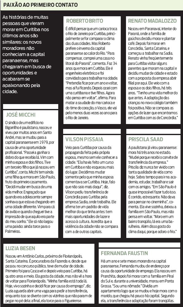 Da empresa para o condomínio, a realidade se repete. José Micchi é síndico de um edifício no bairro Bigorrilho, onde pelo menos 60% dos 26 apartamentos são habitados por pessoas de outros municípios. No prédio, é comum ser vizinho de porta de alguém de outro estado. A torcida pelos times de futebol fica animada: tem figueirenses (Santa Catarina), palmeirenses (São Paulo) e vascaínos (Rio de Janeiro). "No elevador, o assunto volta e meia acaba sendo futebol", conta Micchi.