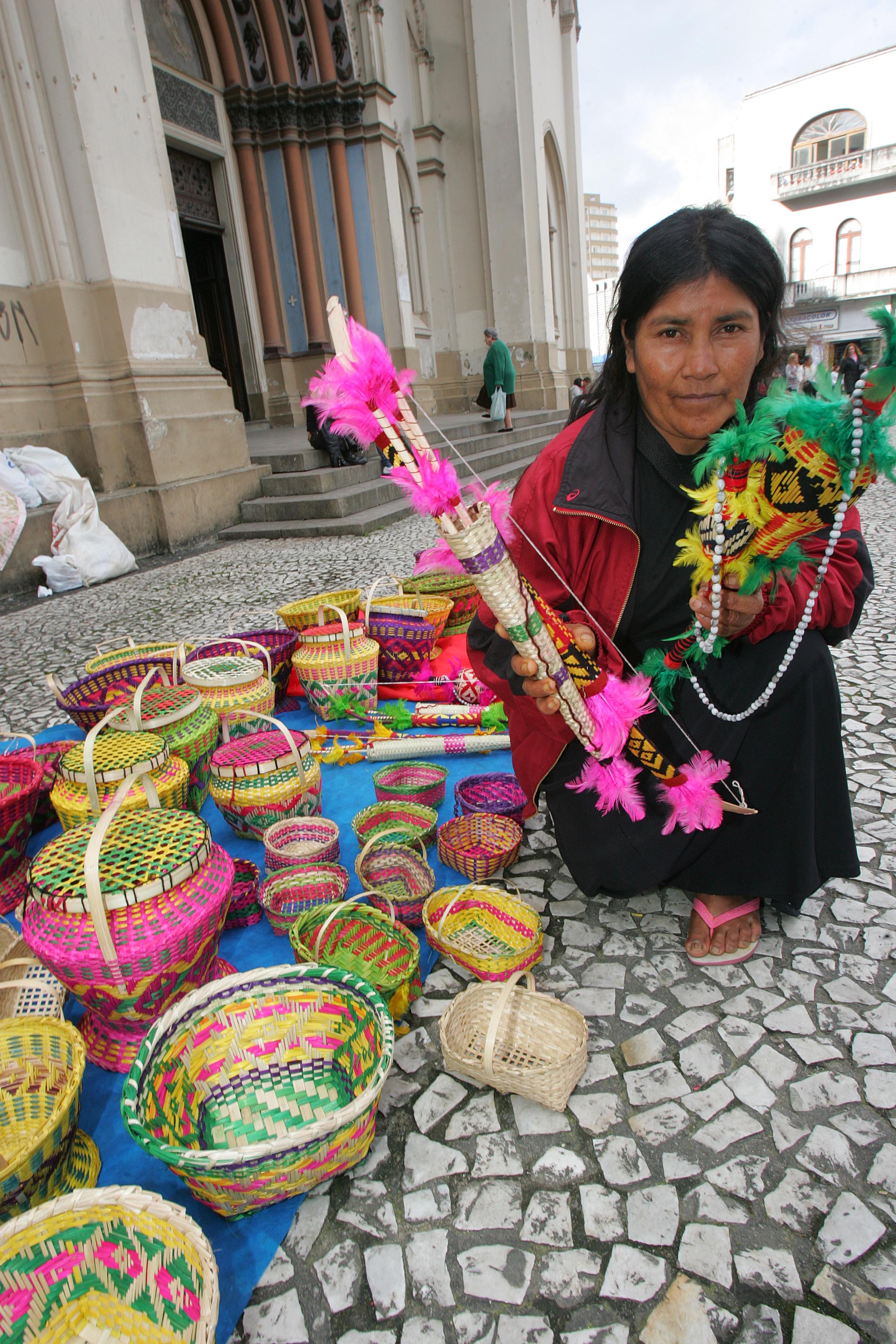É o caso de Justina Generoso, 43 anos, que vem a Curitiba todo fim de mês para vender o artesanato produzido na aldeia em que vive, no Rio das Cobras, em Nova Laranjeiras, região central do Paraná. Durante os cerca de dez dias que permanece na capital, ela dorme na rodoviária em companhia de outras pessoas da tribo. O dinheiro obtido com a venda do artesanato mal dá para a alimentação diária dela e dos quatro filhos.