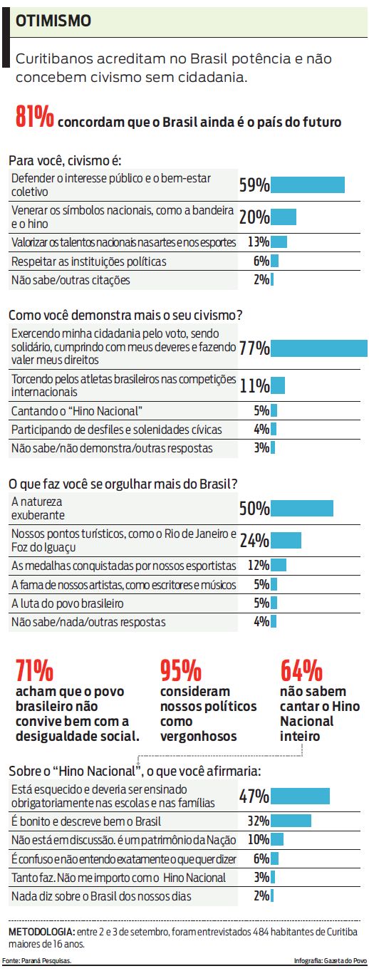 Apesar de todos esses avanços do país, a "natureza exuberante" ainda é o maior motivo de orgulho patriótico para 50% dos curitibanos. Também foram citados os "pontos turísticos, como o Rio de Janeiro e Foz do Iguaçu" (24%), e as medalhas conquistadas por nossos atletas (12%). O levantamento mostra ainda que 74% dos entrevistados nunca sentiram vergonha de ser brasileiro. Entre os que já sentiram alguma vez, porém, 16% indicaram como motivo a classe política, a corrupção e os escândalos. Os políticos brasileiros foram ainda apontados como "vergonhosos" por 95%. Para 71% dos entrevistados, o povo brasileiro não convive bem com a acentuada desigualdade social.