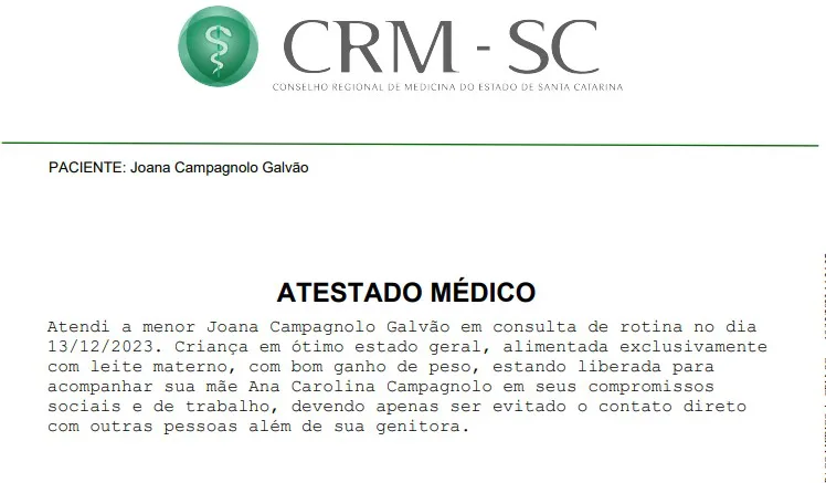 De acordo com sua assessoria, as duas meninas estão liberadas para acompanhar a mãe, inclusive a bebê, que está bem de saúde e mama exclusivamente no peito. “Criança em ótimo estado geral, alimentada exclusivamente com leite materno, com bom ganho de peso”, informa o atestado médico da recém-nascida.