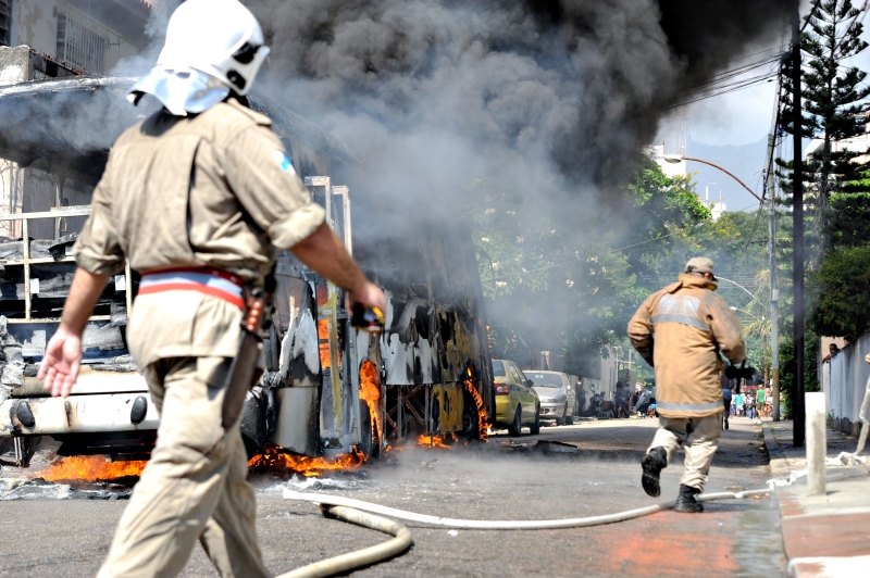 Pelo menos 17 pessoas ficaram feridas, na manhã de ontem, durante a desocupação de um prédio desativado da empresa de telefonia Oi, na zona norte do Rio, que havia sido invadido há quase duas semanas. Entre os feridos, há oito moradores (cinco adultos e três crianças) e nove policiais militares. Revoltados, os desabrigados atearam fogo no edifício desocupado, numa viatura da PM e em seis ônibus, sendo cinco de passageiros e um da Companhia Municipal de Limpeza Urbana. Outros 11 ônibus foram apedrejados.