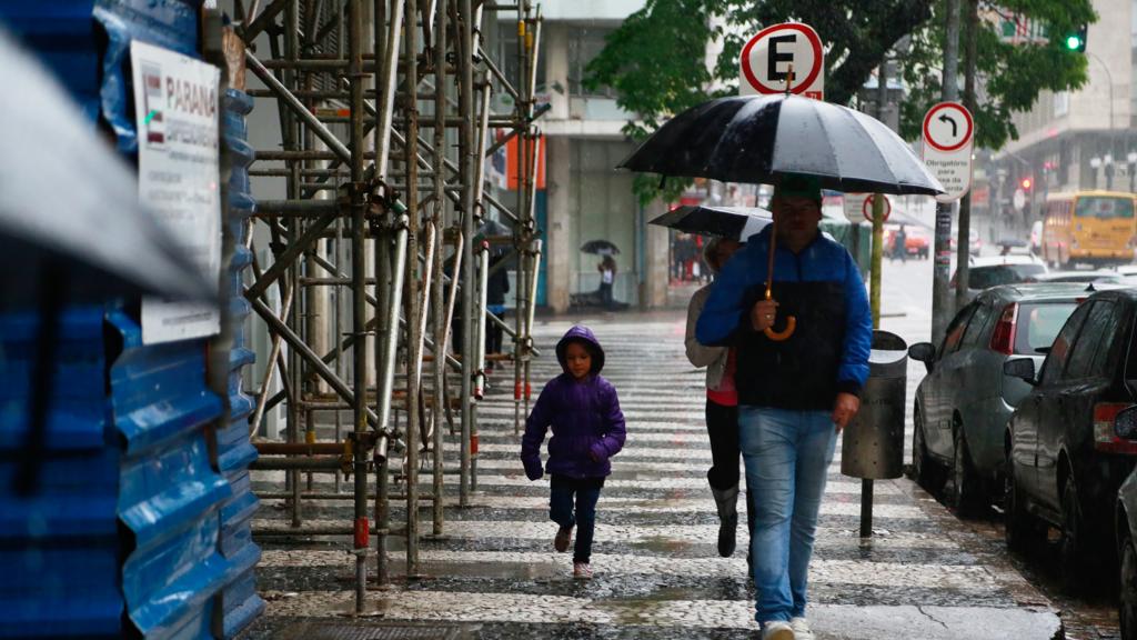 Segundo o Instituto Simepar, a previsão é de que chova a qualquer hora do dia. E o instituto alerta: o encontro da frente fria com um ambiente atmosférico mais quente e úmido sobre o estado também pode contribuir para a ocorrência de temporais. “As chuvas devem começar a partir do Oeste, já na madrugada. Há risco de temporal e também não está descartada a possibilidade de eventos como granizo”, afirma o meteorologista Fernando Mendes.