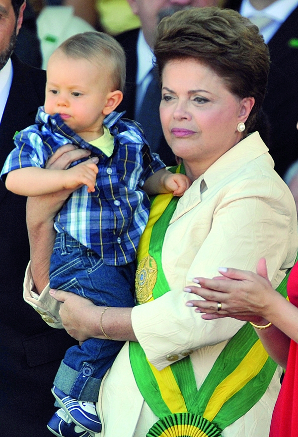 Dilma assistiu ao desfile da tribuna de autoridades, ao lado da filha, Paula Rousseff, e do neto, Gabriel, que completa um ano na sexta-feira. Durante a execução do Hino Nacional, o menino bateu palmas e apontou para os balões coloridos que estavam na Esplanada.