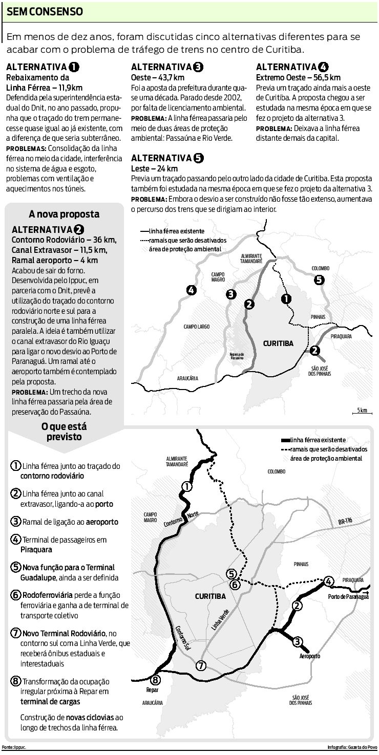 O plano diretor é a quinta proposta de contorno ferroviário discutida em Curitiba em menos de dez anos. Ao contrário das anteriores, entretanto, a nova alternativa deve aliar o sistema ferroviário a outros meios de transporte: aeroviário, rodoviário, marítimo e de ciclovias.