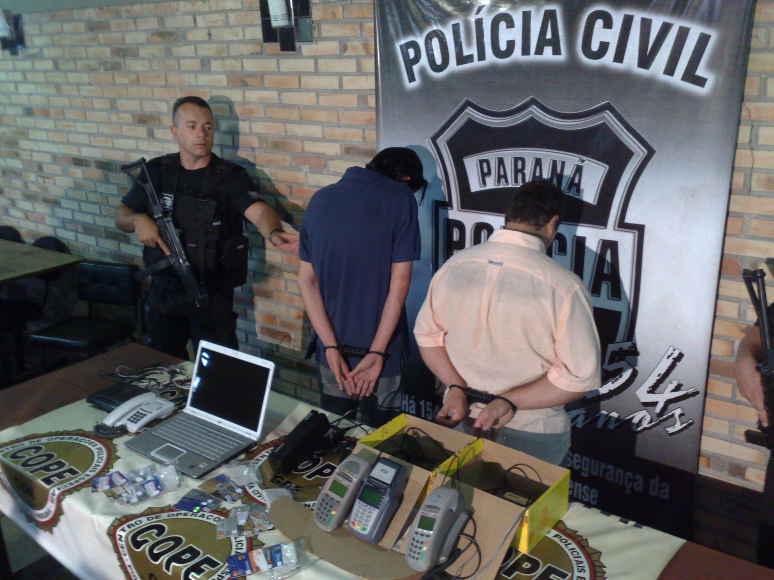 Dois homens que aplicavam golpes com cartões de crédito clonados foram presos na quarta-feira (11) em Curitiba. De acordo com o Centro de Operações Policiais Especiais (Cope), a dupla arrecadou, em um mês, R$ 2 milhões. O esquema todo funcionava dentro de um apartamento no bairro Batel. A polícia ainda investiga o envolvimento de comerciantes no golpe. A polícia apurou que os acusados, Fábio Henrique Chemin da Silva, 30 anos, e Edward Cristian Goulart, 40, compravam dados de usuários de cartões de crédito de vários países em um site russo. Segundo o delegado Francisco Caricati, que comandou as investigações, hackers americanos estavam por trás da venda. Eles invadiam sites de bancos e operadores de cartão, roubavam as senhas e as informações dos clientes e vendiam. A dupla presa em Curitiba pagava em média R$ 1 mil pelos dados.