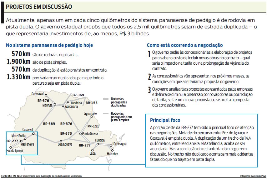 A duplicação de 14,4 quilômetros da BR-277, na Região Oeste do Paraná, deve começar em 40 dias sem que esteja definido como a obra será paga. A execução do investimento de R$ 50 milhões depende obrigatoriamente de uma alteração no contrato de pedágio em vigor. Um acidente com cinco mortos na rodovia, há 20 dias, forçou o anúncio da reforma. Assim, governo estadual e concessionárias, em negociação formal desde maio para revisar os contratos de pedágio no Paraná, deram o primeiro passo para tornar irreversível mais uma mudança nas bases dos convênios.