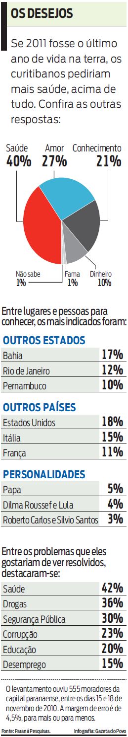 Se há uma certeza sobre profecias é de que elas só se confirmam ou não com o tempo. Mas a ideia de encerrar a vida na Terra em uma data tão próxima inspirou reflexões para moradores de Curitiba. A pedido da Gazeta do Povo, a Paraná Pesquisas perguntou aos curitibanos mais precisamente a 555 deles, entre os dias 15 e 18 de novembro se a possibilidade de 2011 ser o último ano de suas vidas mudaria alguma coisa em seus desejos de ano-novo mais frequentes. A maioria (70,81%) respondeu que não desejaria algo diferente dos anos anteriores e priorizou saúde (40,36%), amor (26,85%) e conhecimento (21,44%). A saúde também ocupou o primeiro lugar (41,62%) na pergunta sobre que problemas eles gostariam de ver resolvidos, seguida da questão das drogas (36,40%) e da segurança pública (30,45%).