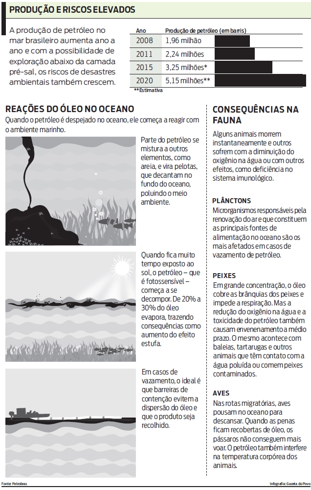 "Não se trata só de proteger a baleia, o coral e o peixinho. Algumas atividades, como a pesca e o turismo, podem ser afetadas também. E vivemos numa cadeia, em que um animal come o outro. Pode chegar até nós um peixe contaminado", explica a bióloga Leandra Gonçalves, da ONG Greenpeace. Quando vaza no mar, o petróleo mata instantaneamente algumas espécies no local do derramamento e à medida que vai se espalhando prejudica a qualidade da água e causa a morte lenta de animais e plantas. A toxicidade do petróleo e a diminuição do oxigênio na água causam graves danos ao ambiente marinho.