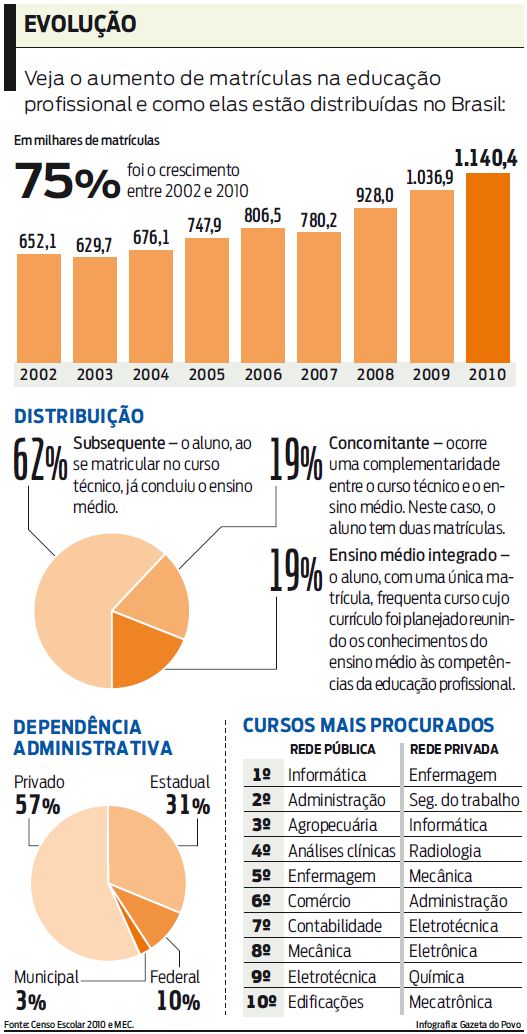 A educação profissional cresceu 74,9% no Brasil entre 2002 e 2010, passando de 652 mil matrículas para 1,14 milhão no período. Enquanto a oferta de ensino médio regular se estabilizou no país nos últimos anos, o número de alunos nos cursos técnicos em nível médio está em expansão. Para especialistas, esses cursos proporcionam melhor qualificação profissional e se traduzem em maior empregabilidade e ganho salarial aos alunos. Uma pesquisa feita pela Fundação Itaú Social mostrou que estudantes com formação em ensino médio profissionalizante ganham 12,5% a mais do que os que cursaram o ensino médio comum. A diferença é ainda maior para os alunos que optaram pela área de indústria, com um aumento de salário anual de 18,8%. Para os pesquisadores, o ensino médio técnico permite aos jovens entrar no mercado de trabalho sem ter de arcar com o tempo e o investimento de um curso superior.