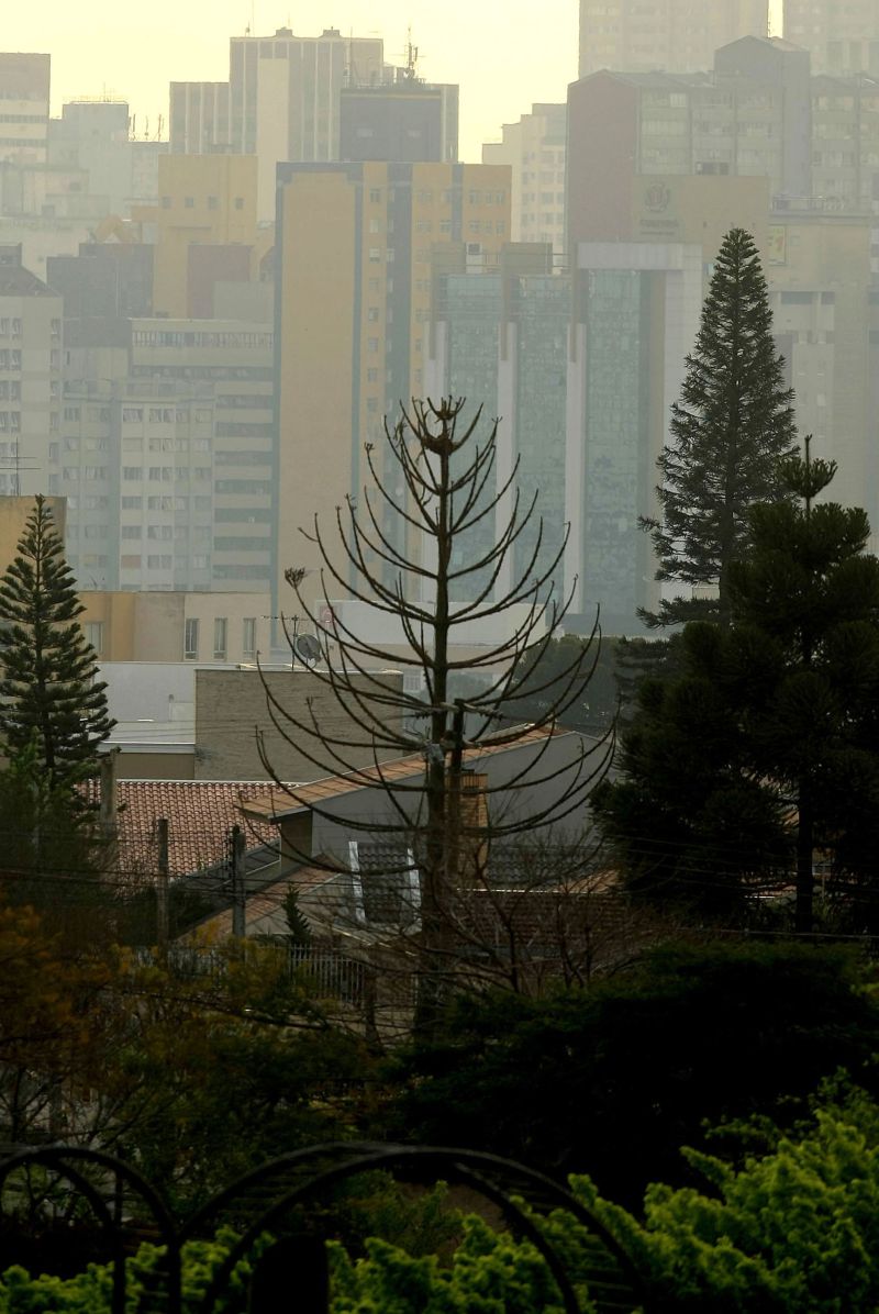 Em primeiro plano, uma Araucária angustifolia, o pinheiro do Paraná, agoniza erguendo os braços para o céu. Se foi morte natural, tudo bem. O pior é quando se trata de "morte matada", de alguém que quer limpar um terreno e trata de assassinar a árvore com salitre, óleo queimado ou outra substância jogada nas raízes. Reparem que é um pinheiro novo, a julgar pelo número de galhos. Tinha a vida pela frente.