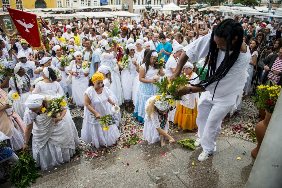 A 'limpeza' da escadaria foi feita com flores e ao som de batuques e de cantos de origem africana