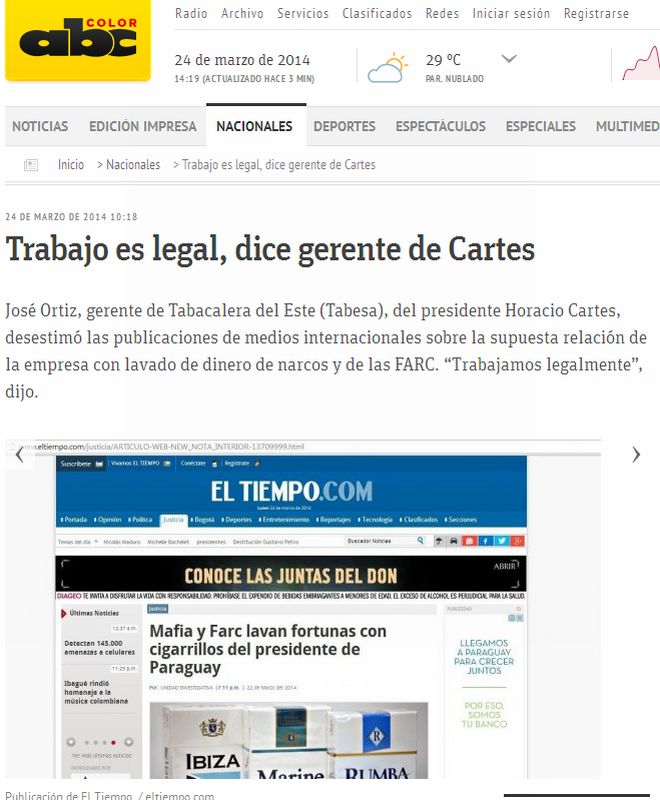 José Ortiz, gerente da Tabacalera del Este (Tabesa), que pertence ao presidente Horacio Cartes, refutou a relação da empresa com a lavagem de dinheiro de narcotraficantes e das Farc (Forças Armadas Revolucionárias da Colômbia).