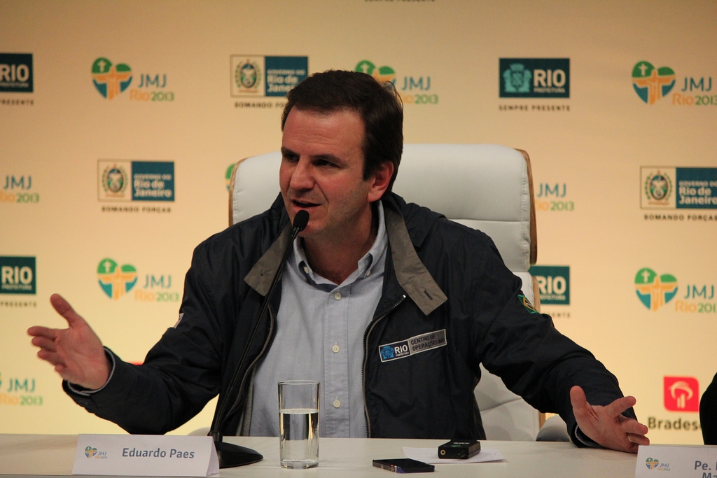 Ele disse, no entanto, que a decisão de levar o evento a um local mais pobre, fora da zona sul, foi um "pedido da Igreja Católica". "A Igreja pediu um evento que não fosse em Copa (cabana), mas na zona oeste ou norte. A zona norte é muito adensada. Até se pensou no Campo dos Afonsos, depois na Base Aérea do Galeão, não foi possível por dificuldades das Forças Armadas de desmobilizar armamentos. Buscou-se um lugar menos adensado." Paes afirmou não saber se o terreno pertence ao empresário de ônibus Jacob Barata.