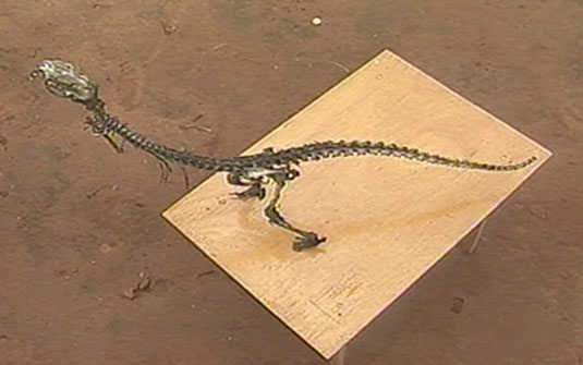 A ossada tem aproximadamente um metro de comprimento. O animal tinha dentes de roedor, duas patas e uma cauda longa - semelhante a de um lagarto.